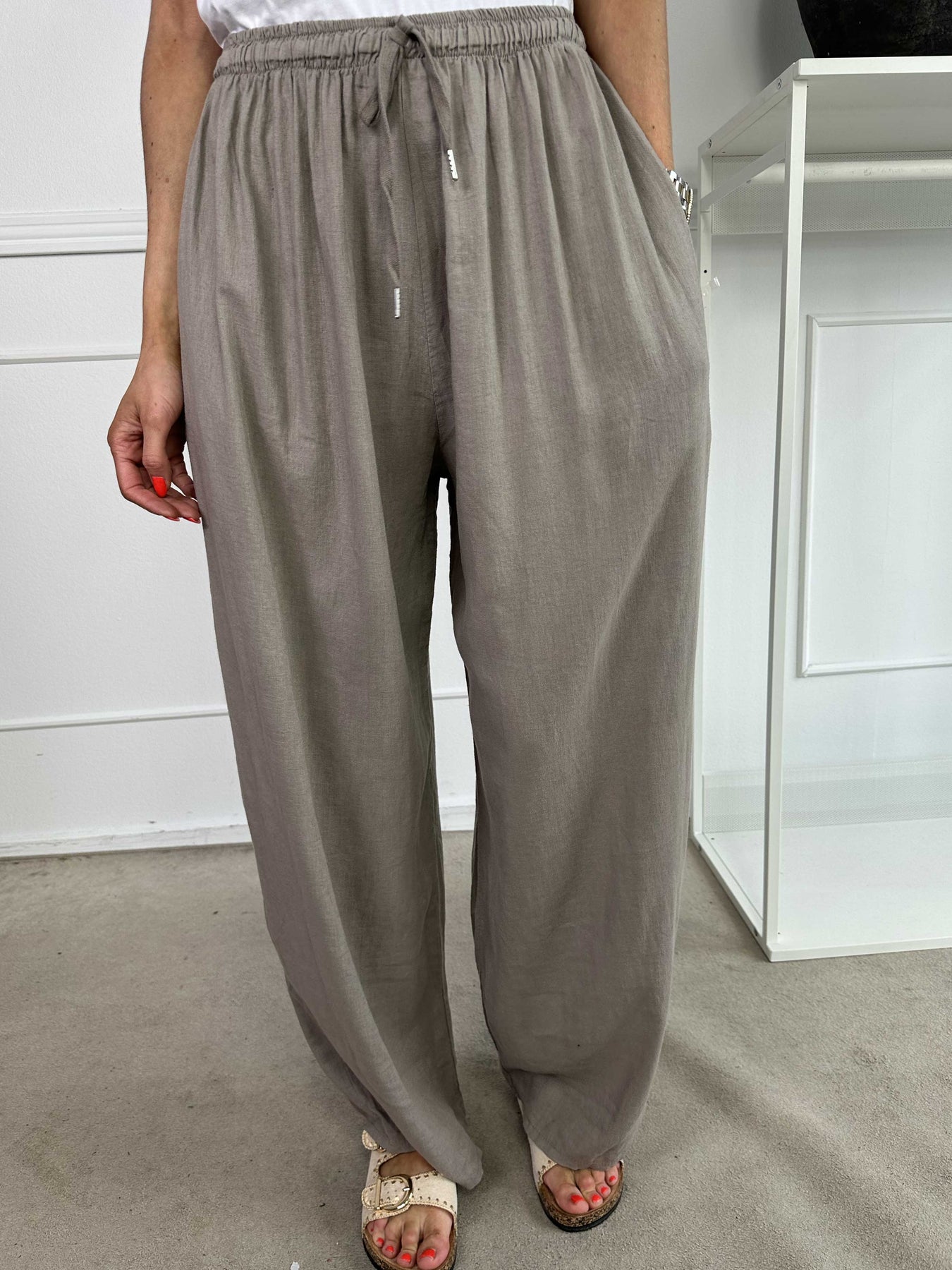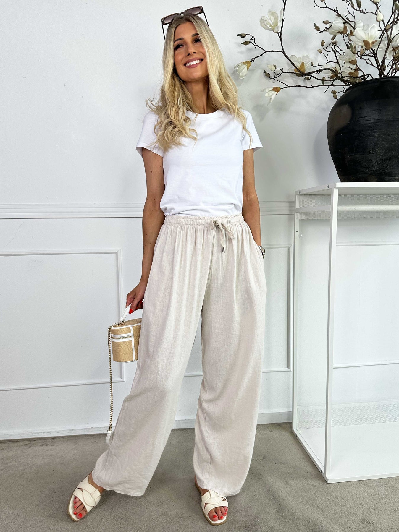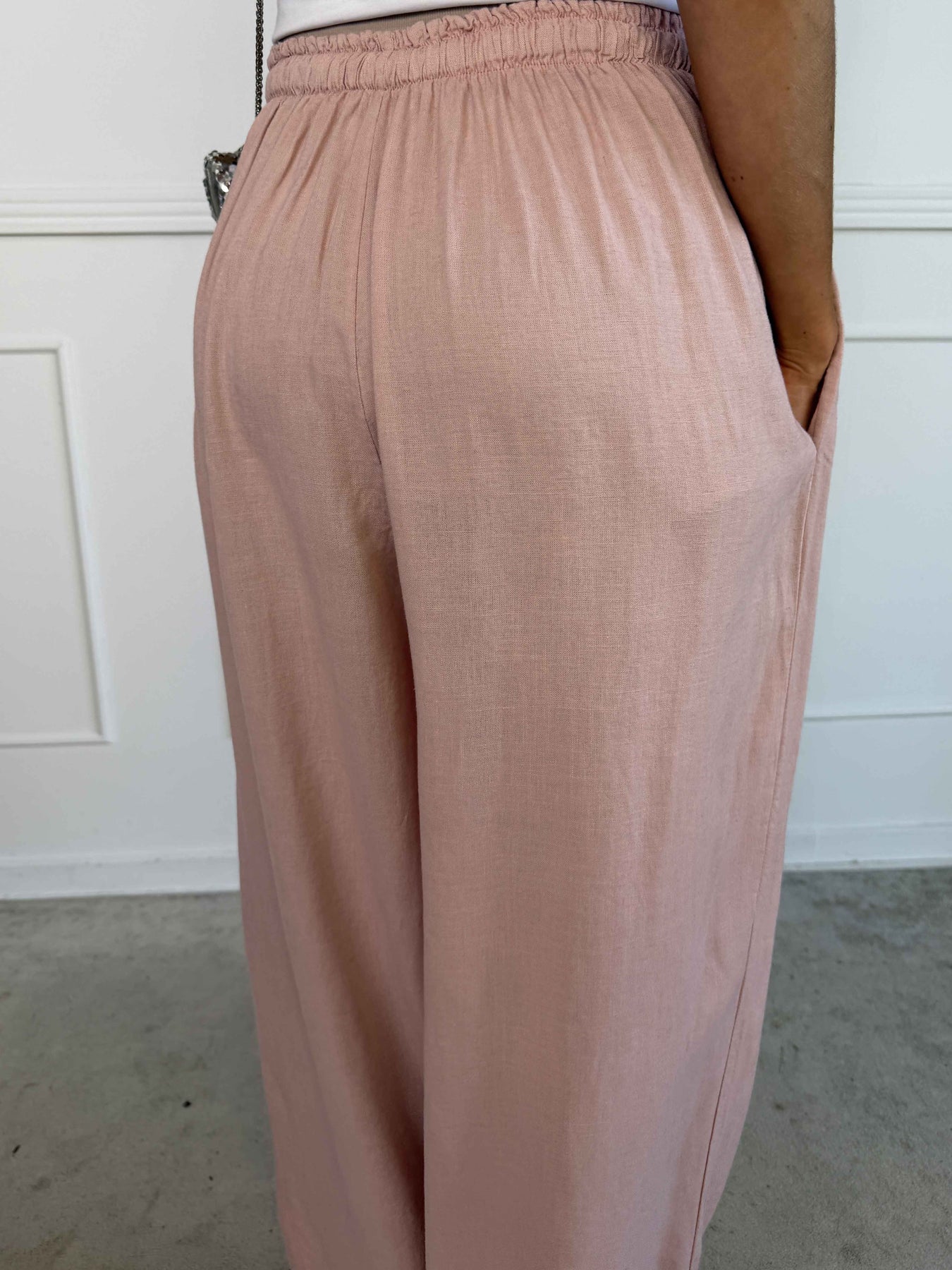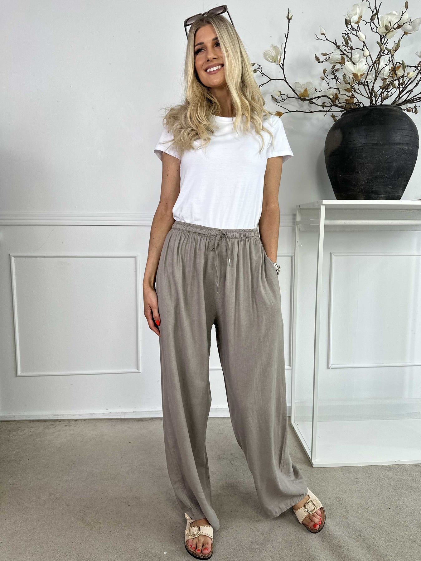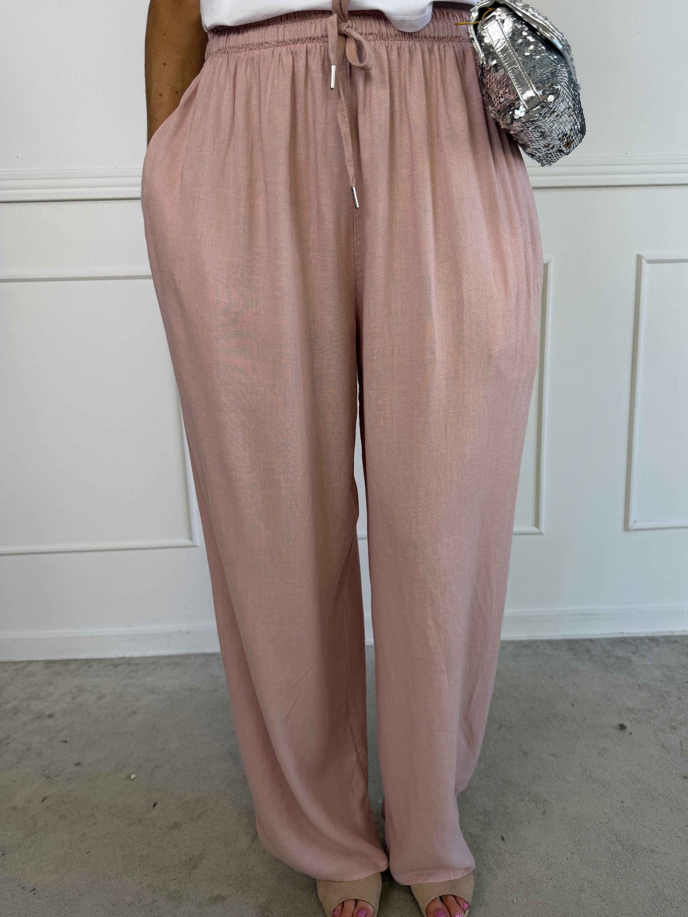 Lette bukser i viskose og hør. Der er elastik og snøre i buksekanten.