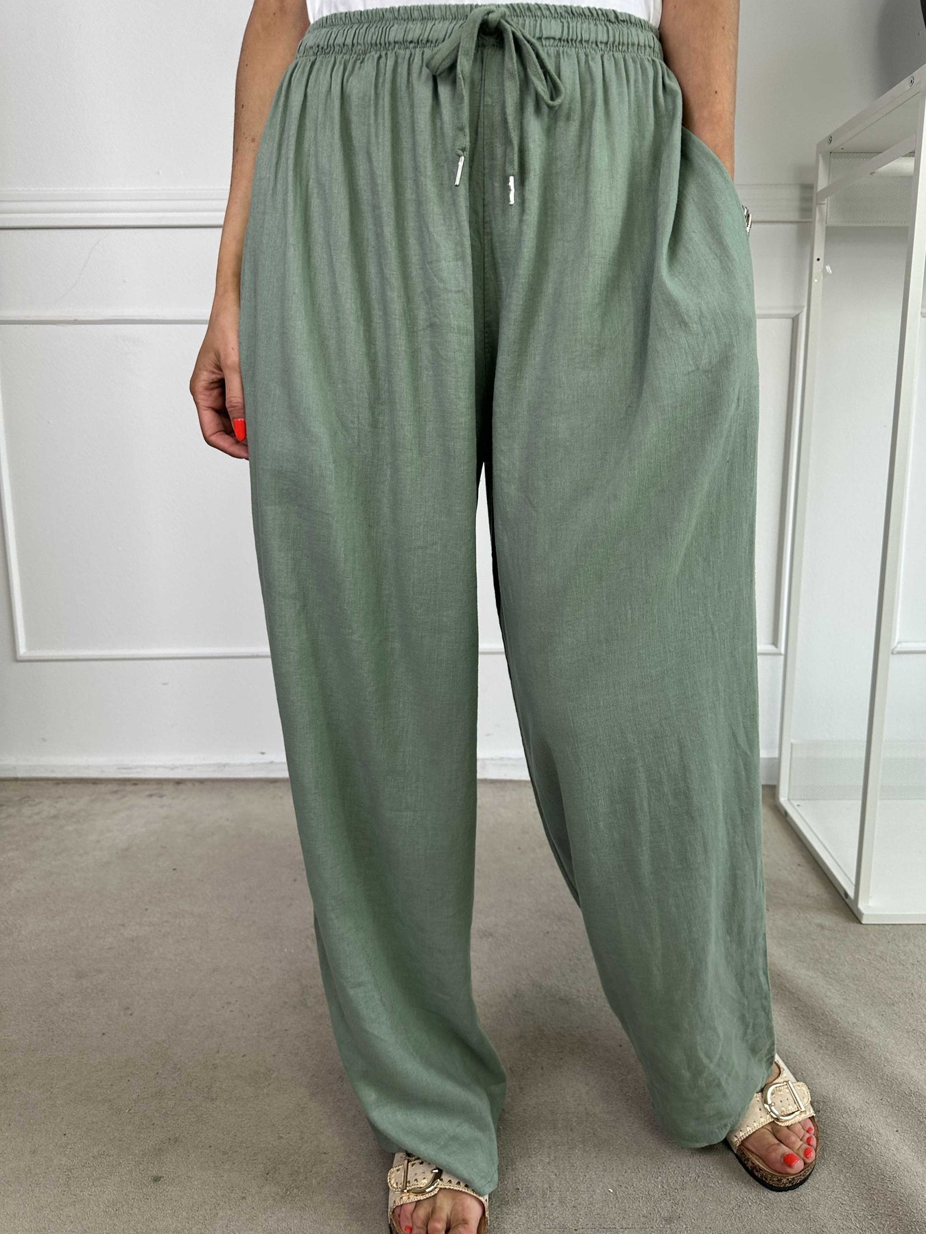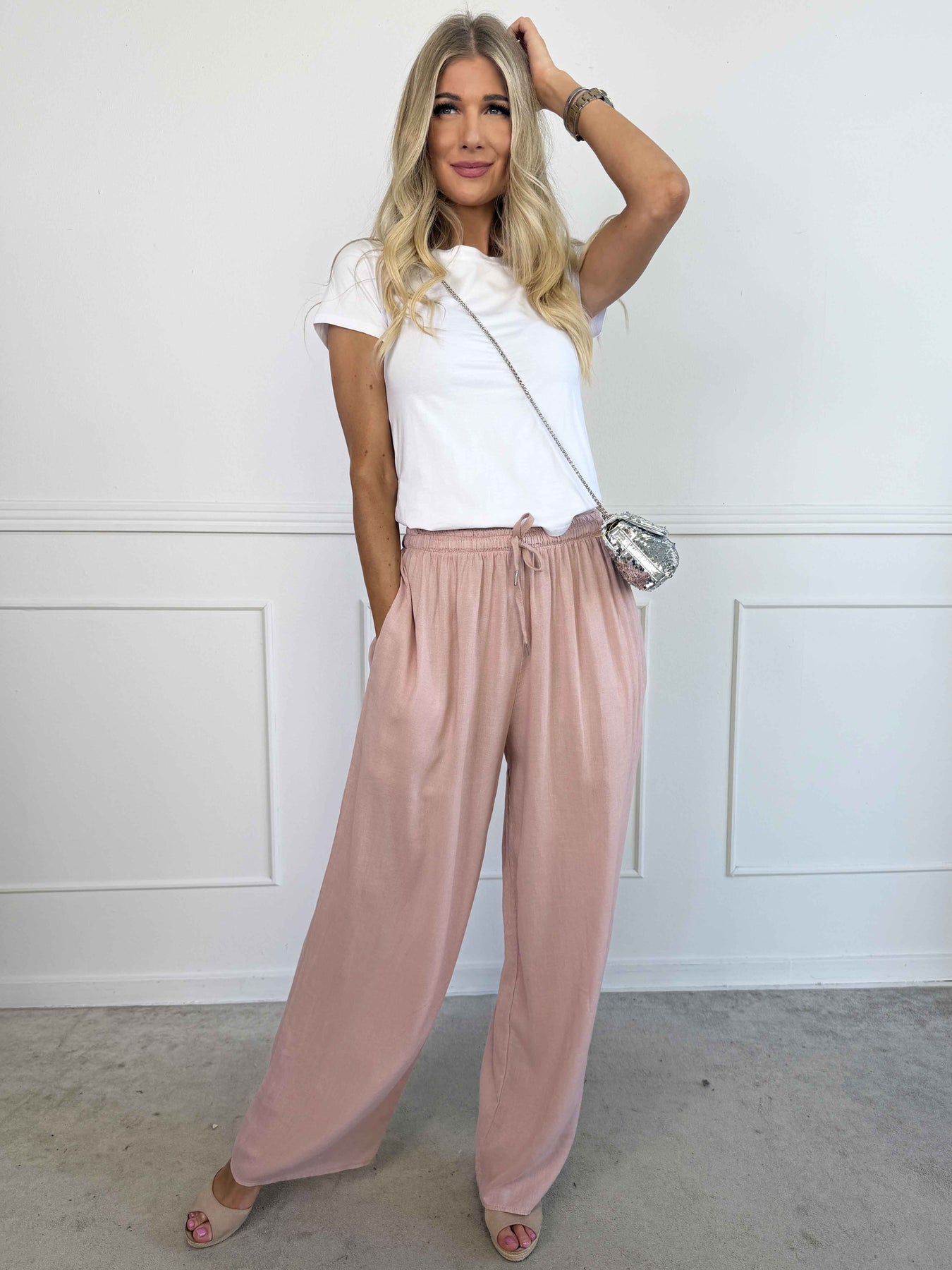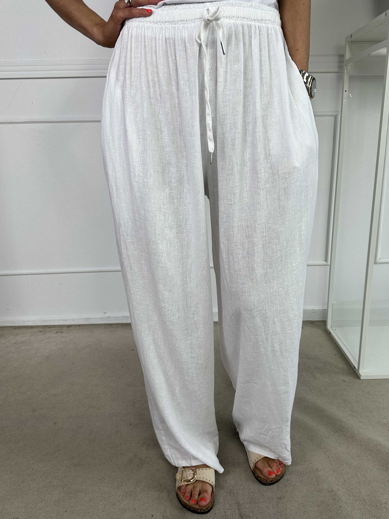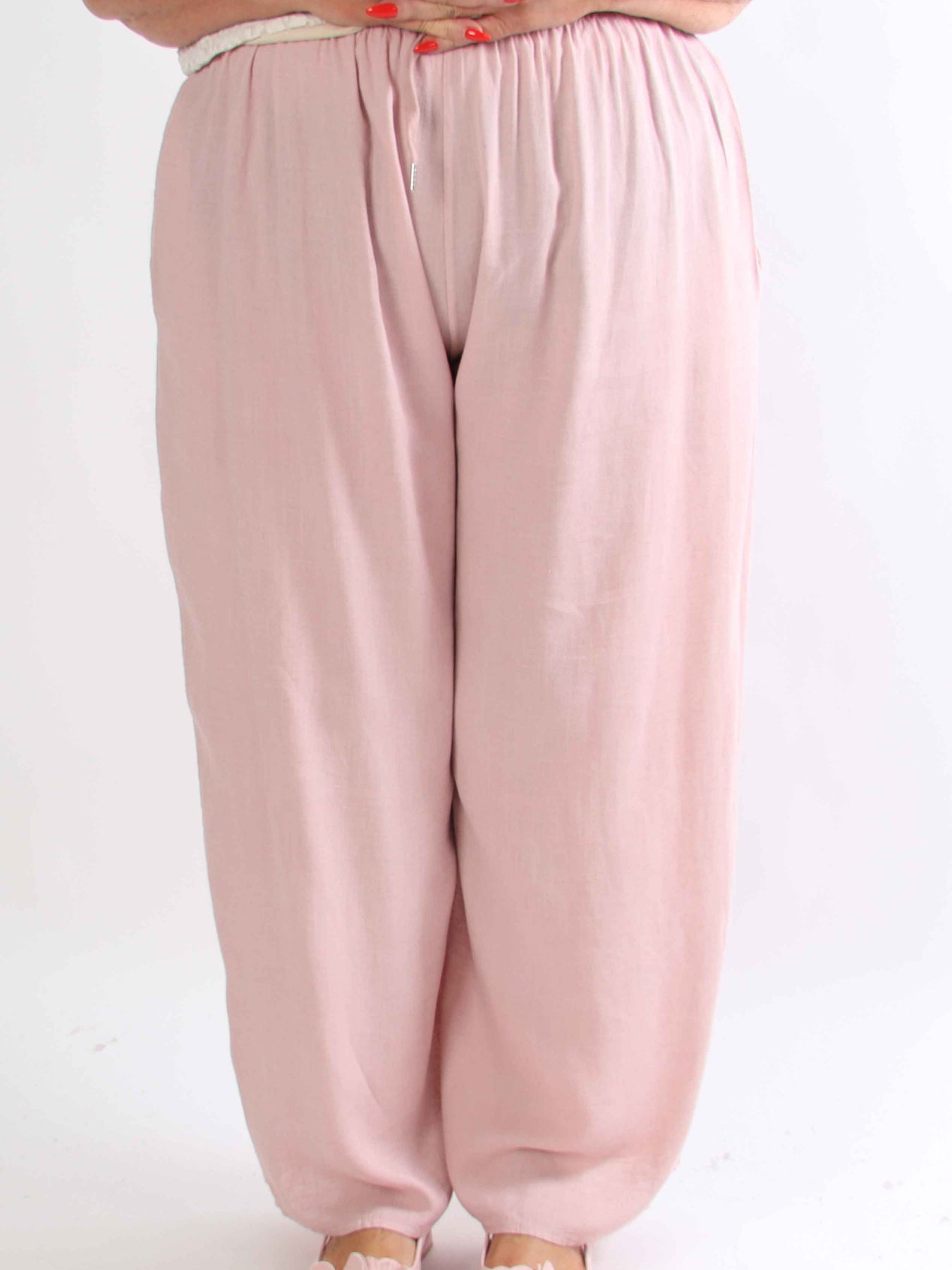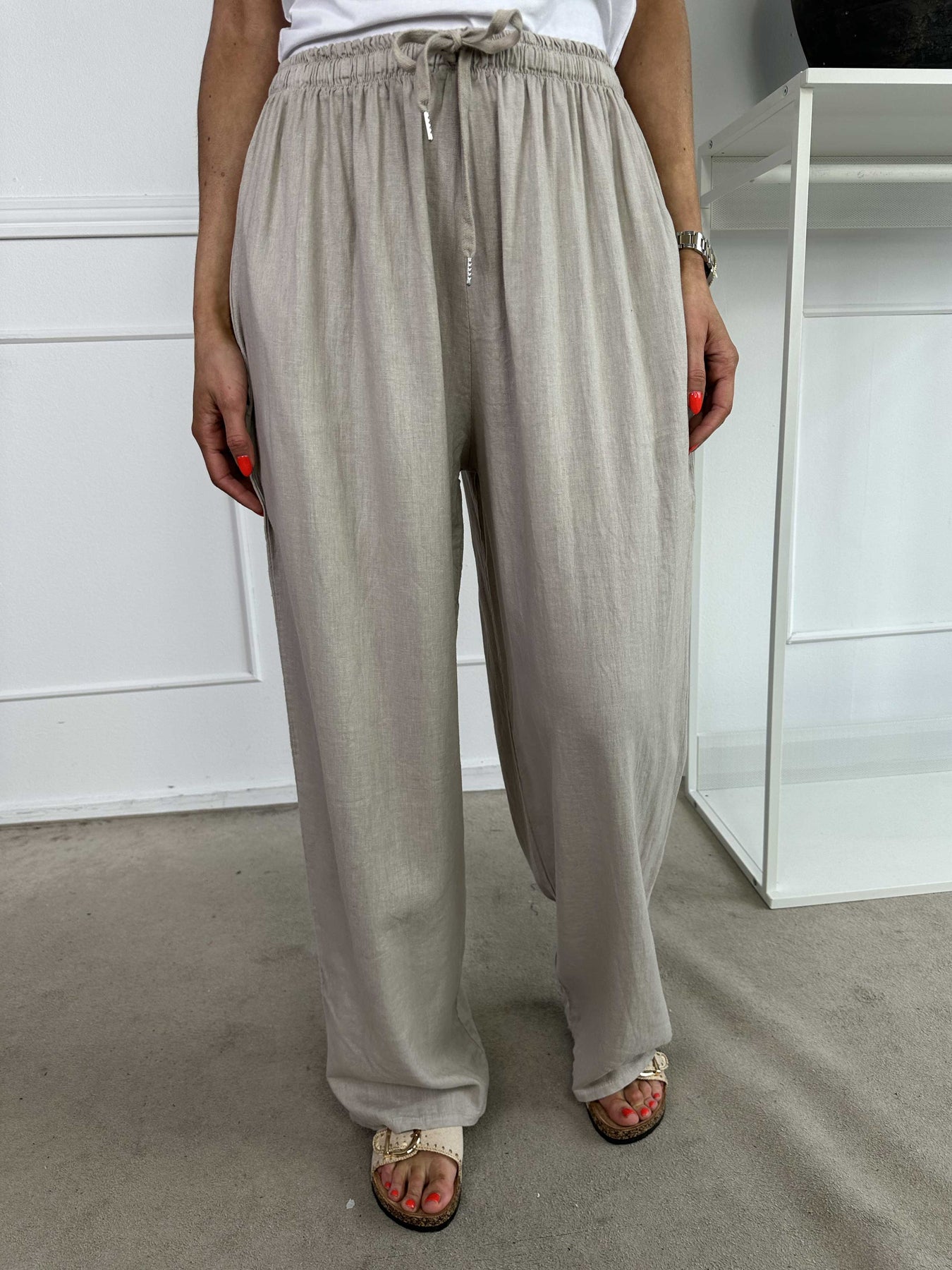 Lette bukser i viskose og hør. Der er elastik og snøre i buksekanten.