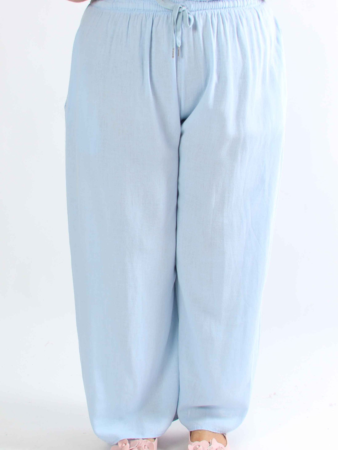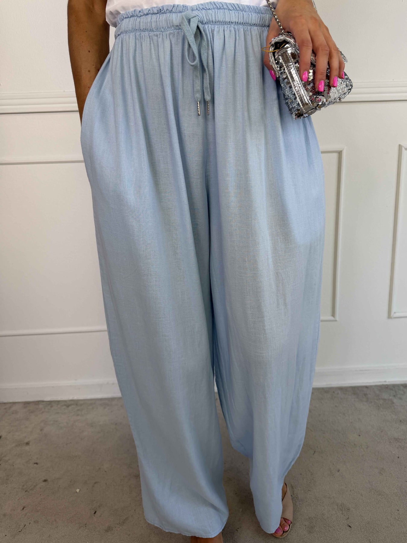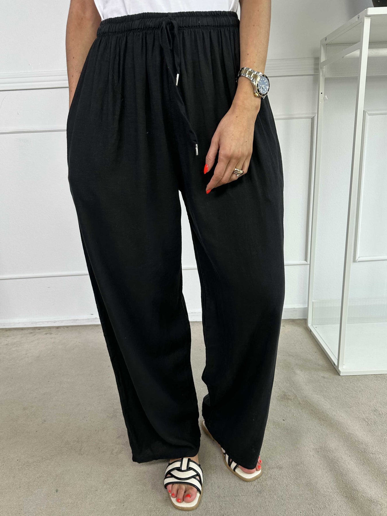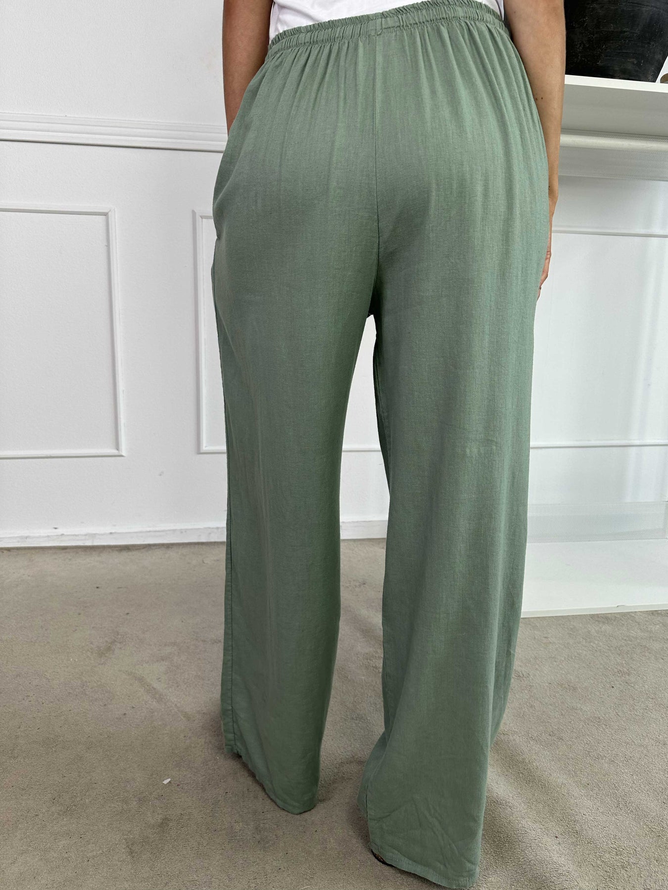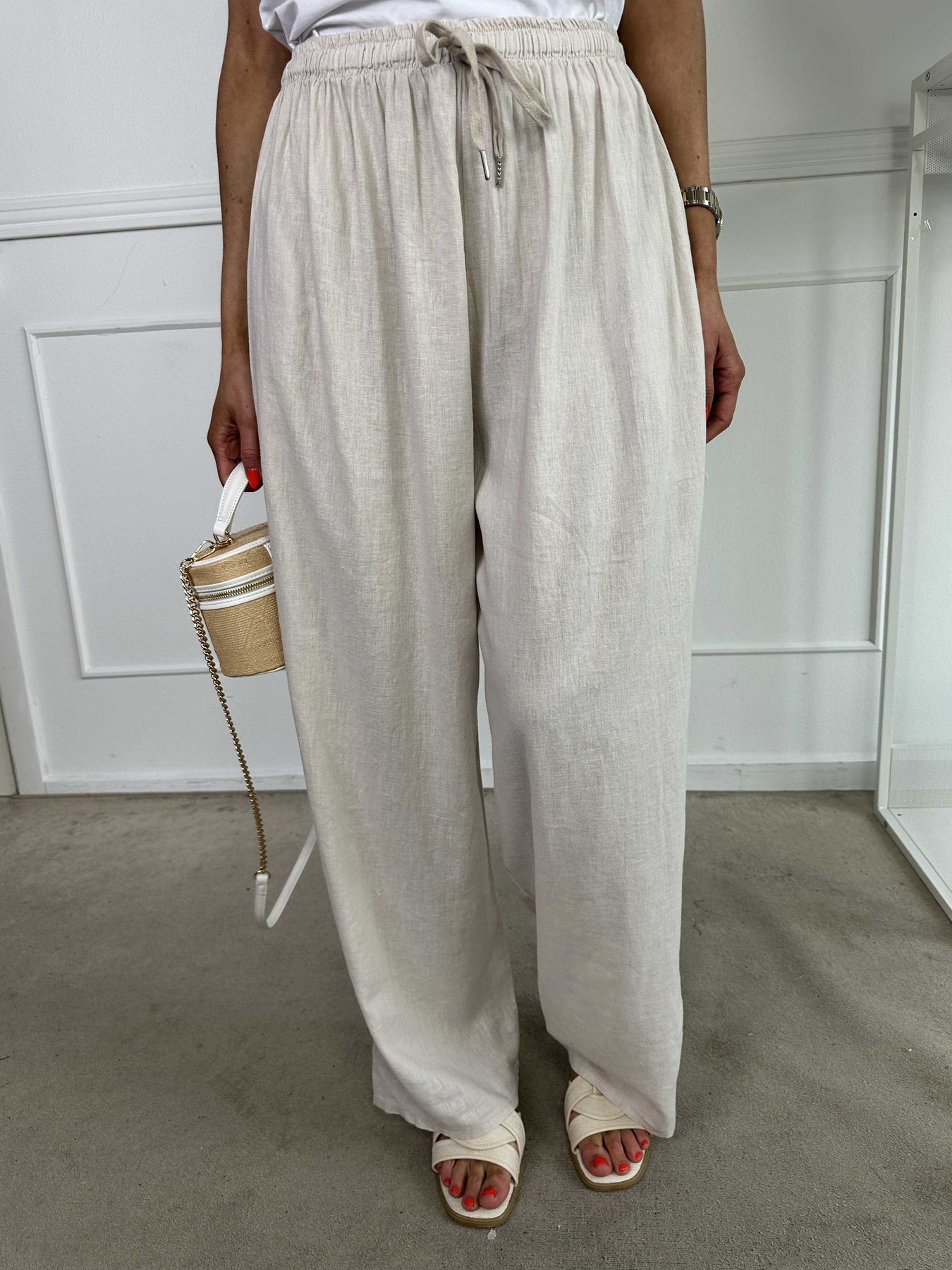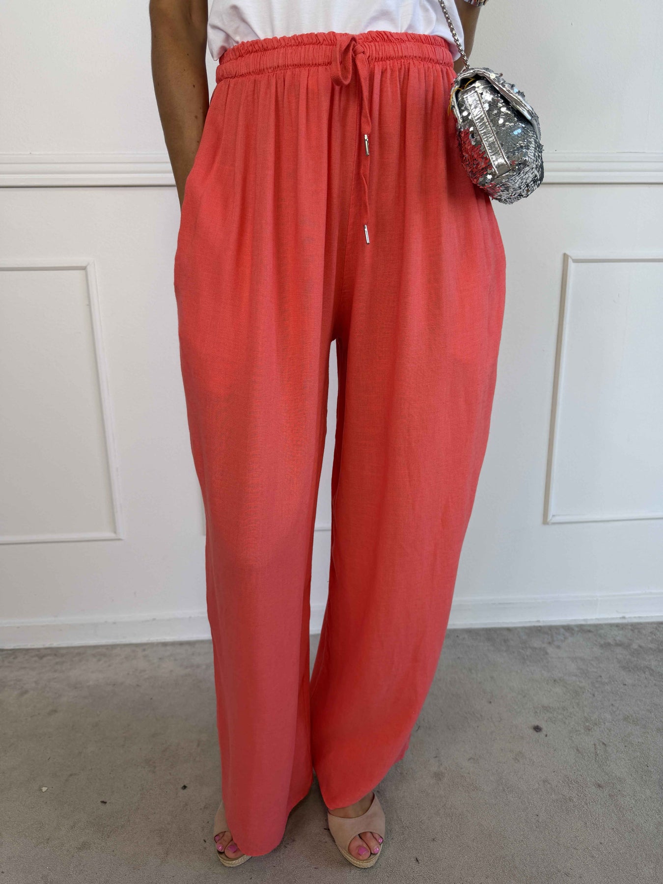 Lette bukser i viskose og hør. Der er elastik og snøre i buksekanten.