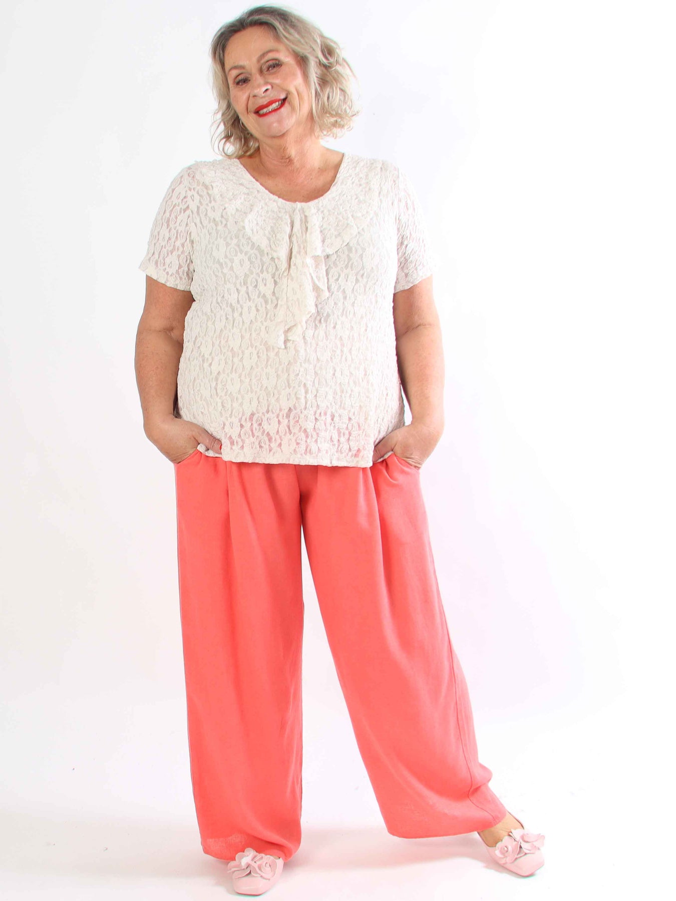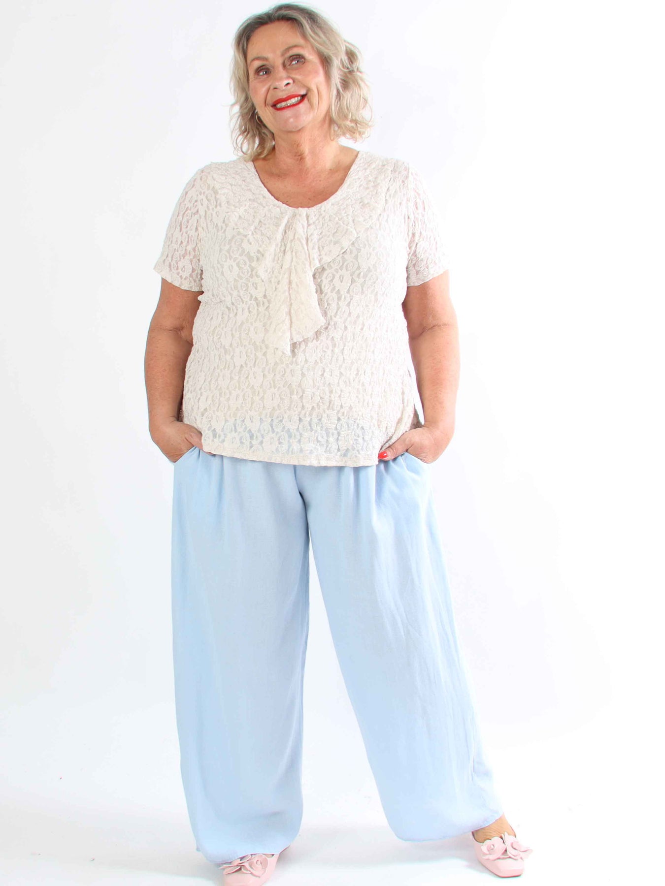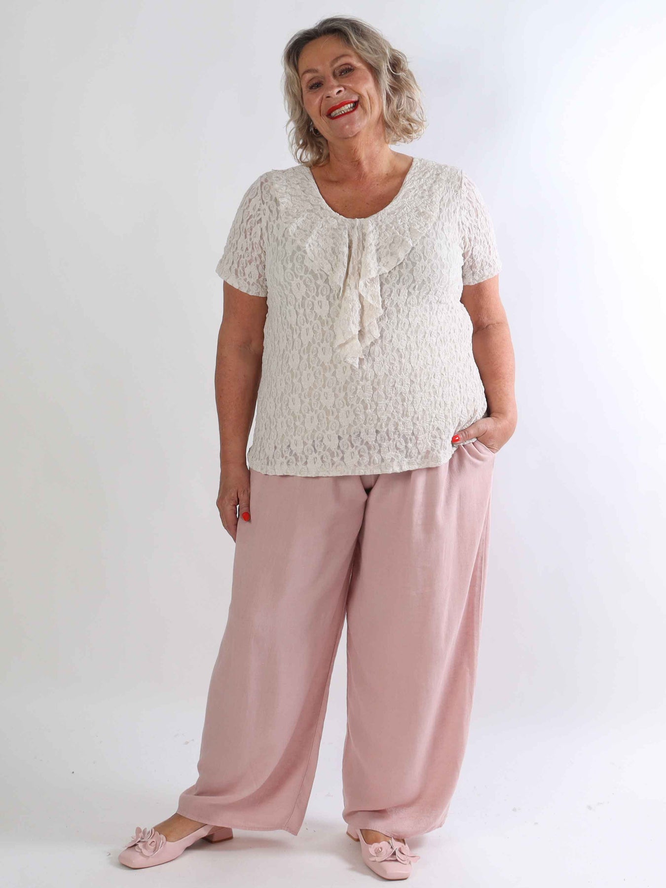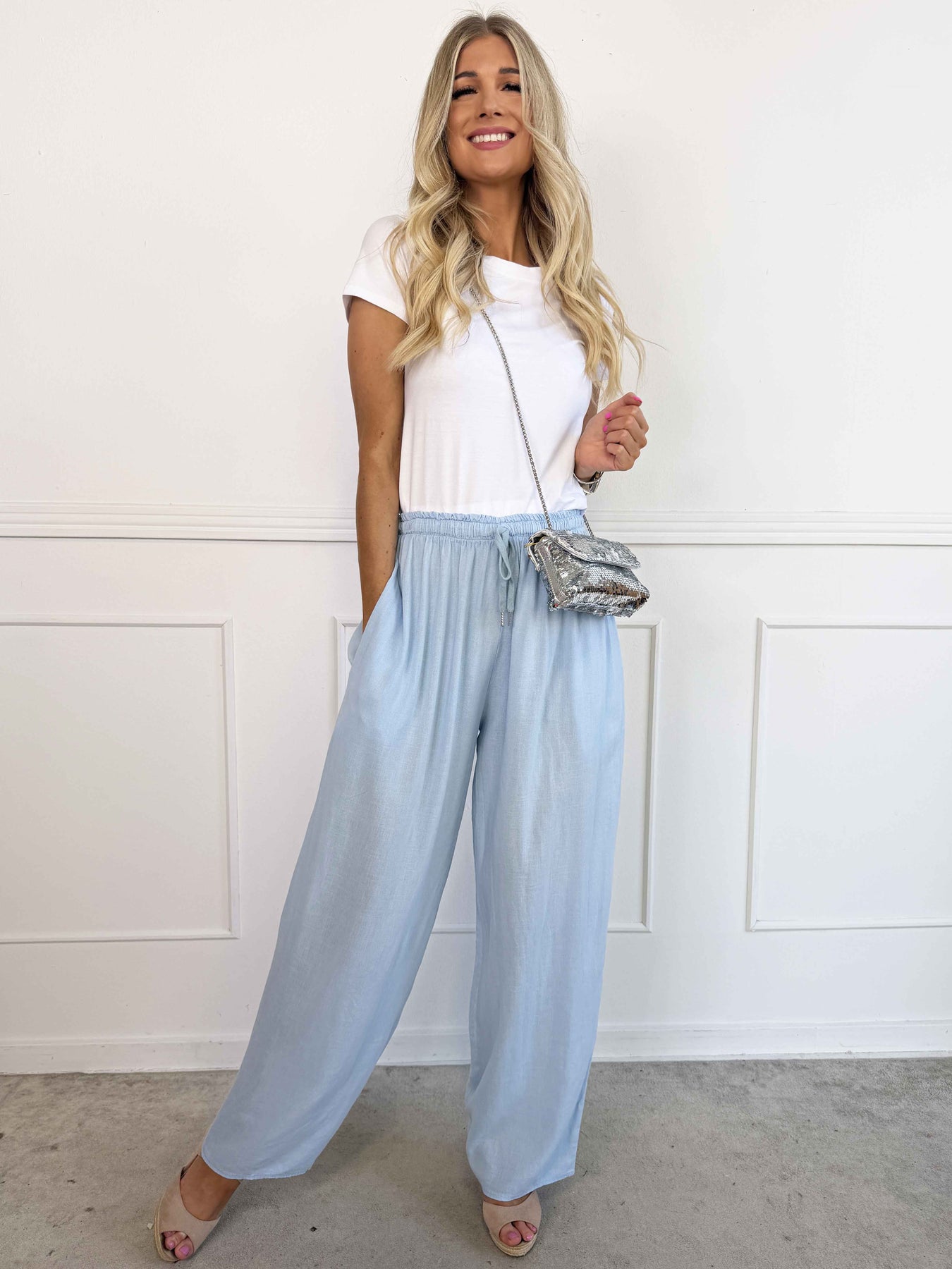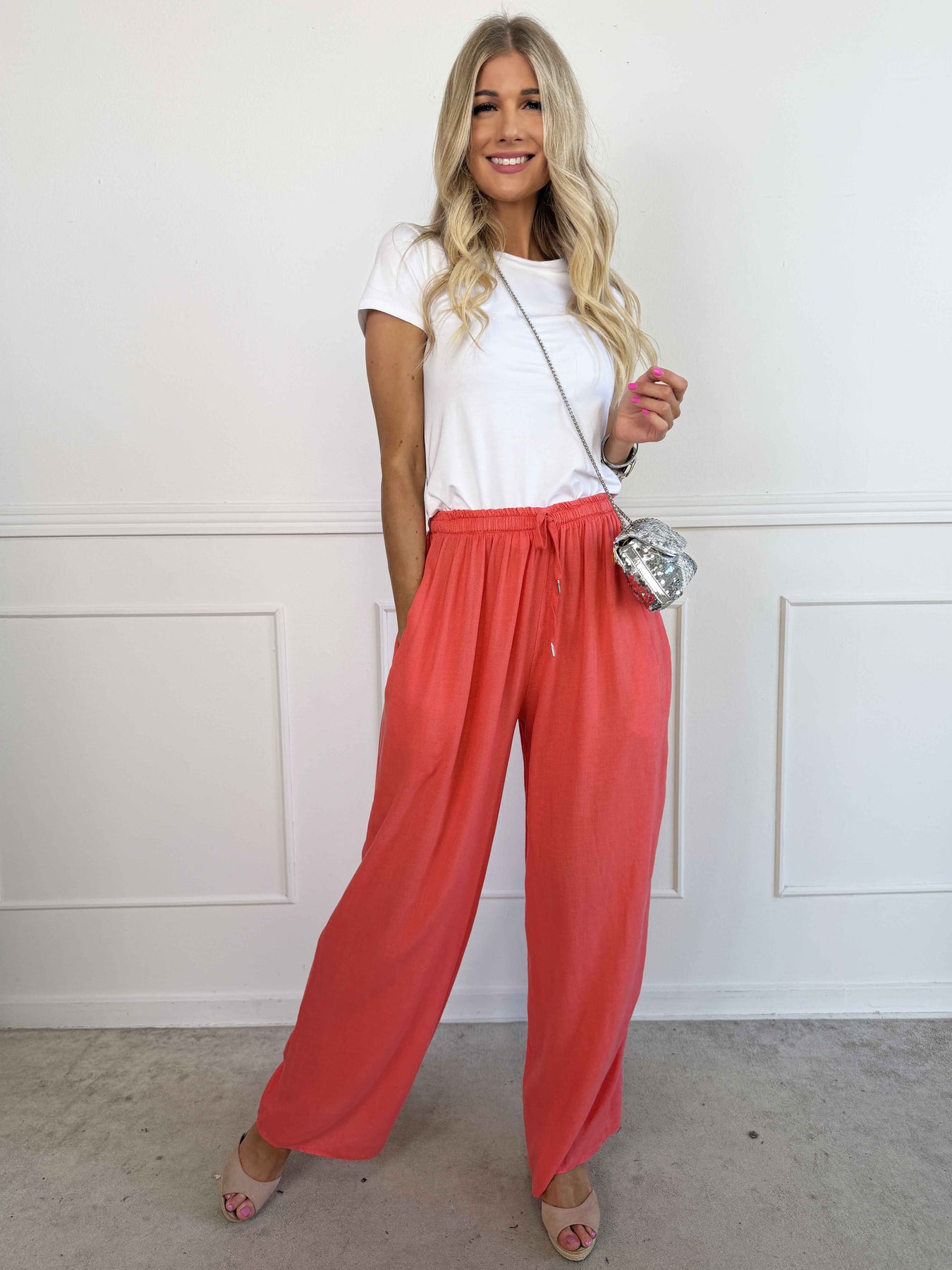 Lette bukser i viskose og hør. Der er elastik og snøre i buksekanten.